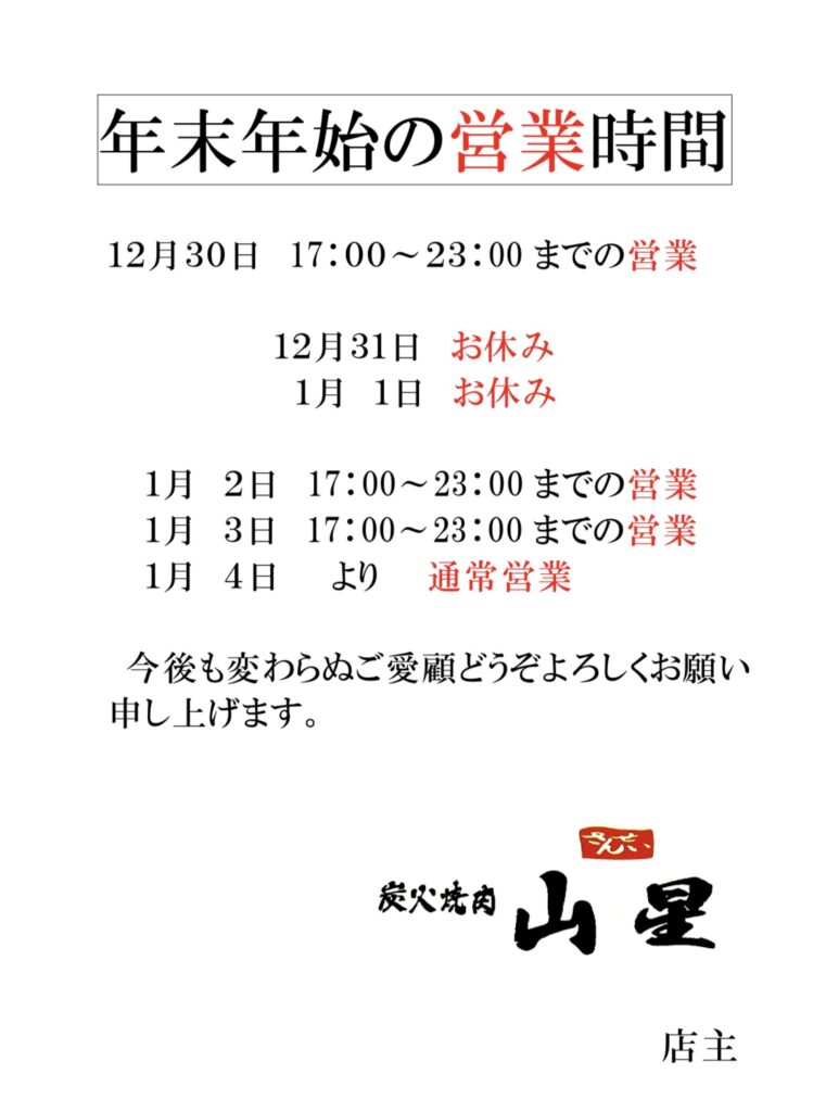 年末年始☆営業時間のお知らせ 2025.12.122025.12.12 HOME ブログ 新着情報 年末年始☆営業時間のお知らせ Post Share Line note 年内は30日まで、年始は2日より元気に営業いたします!! 職場の宴会☆プライベートのお食事会 ご予約ご相談承ります。 何なりとお問い合わせくださいませ♪ 皆様のお越しを心よりお待ちしております。 Screenshot Post Share Line note クリスマス🎄シーズン 食事会スルー☆忘年会・新年会ヤルー 関連記事一覧 食事会スルー☆忘年会・新年会ヤルー 2025.12.25 「ワーク・ライフ・バランス」 2025.11.11 価格改定のお知らせ 2025.02.24 春のお食事☆ご予約承ります 2025.04.04